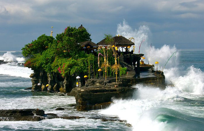 Tanah Lot means “Land (sic: in the) Sea” in the Balinese language. Located in Tabanan, about 20 kilometres (12 mi) from Denpasar.